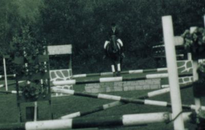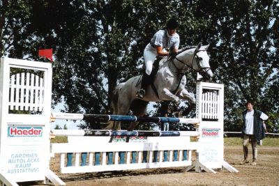 Danach wagte ich mich auch mit "Sagun" auf Turniere, allerdings mit meist katastrophalem Ausgang...der war dafür einfach nicht gemacht...er sprang meinstens wie ein Hubschrauber: Zog an wie ein Geisteskranker, ließ sich auch nicht mehr zurücknehmen - und entweder er sprang einen halben Meter ÜBER das Hindernis, oder er zog die Bremse oder er bremste und sprang dann aus dem Stand...